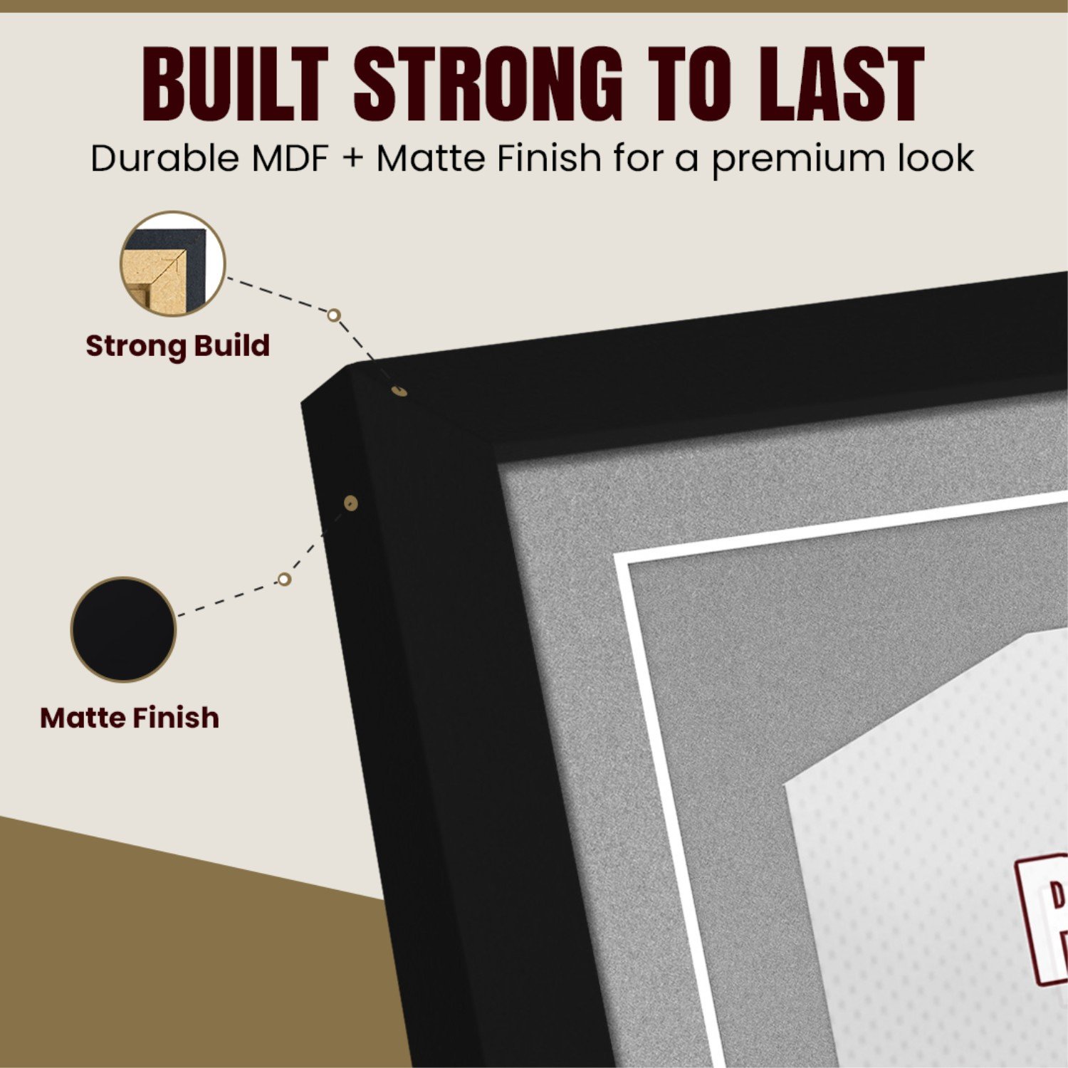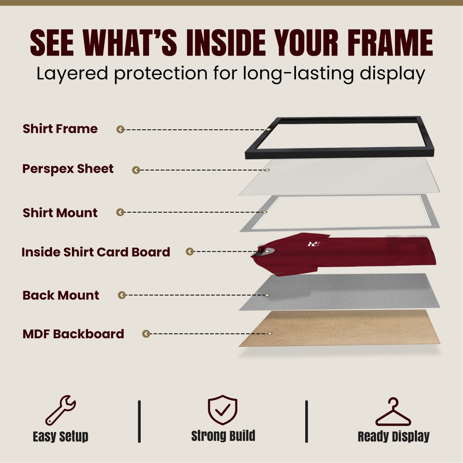 Thanks to the simple and convenient mounting system (complete with a mounting card, shaping insert, and adhesive strips), you can showcase your treasured t-shirt in a crisp and professional display in just a few minutes. No sewing, pinning, or specialized tools are required to beautifully frame your keepsake. Made from sturdy yet lightweight engineered wood, the frame comes equipped with pre-installed wall hooks, allowing you to proudly display your shirt as soon as it's assembled.